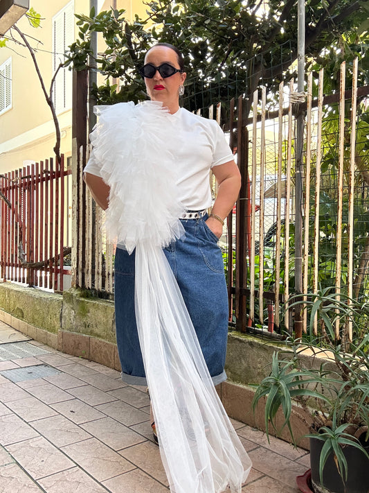 T-SHIRT LUMINA BIANCA CON MAXI ROUCHES IN TULLE